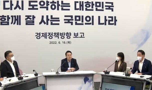▲윤 대통령이 16일 판교 제2테크노밸리 기업성장센터에서 열린 새정부 경제정책방향 발표 회의에서 발언하고 있다.(사진=KTV 방송화면 캡쳐본) |