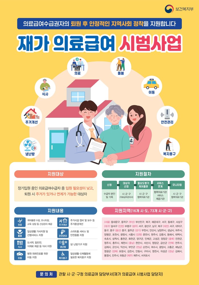 재가 의료급여 사업은 입원 필요도가 낮은 장기입원 의료급여수급자가 퇴원 후 자신의 집에서 의료·돌봄·식사·이동 등 통합서비스를 제공받으며 지역사회에서 정착할 수 있도록 지원하는 신규 의료급여사업이다.