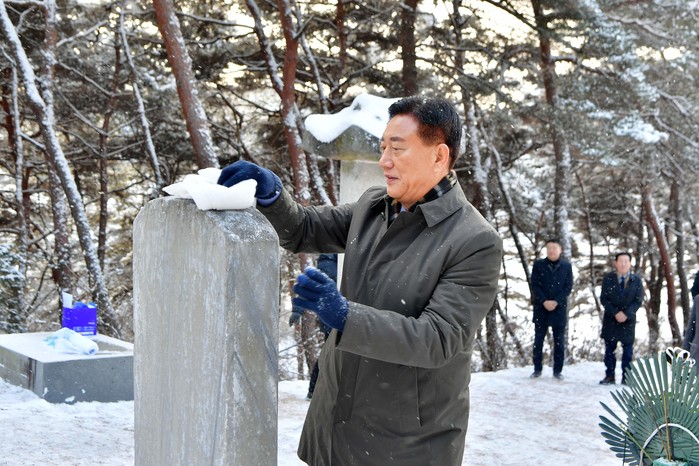 | ▲김한종 군수가 박수량 백비를 닦고 있다.(사진제공=장성군) |
