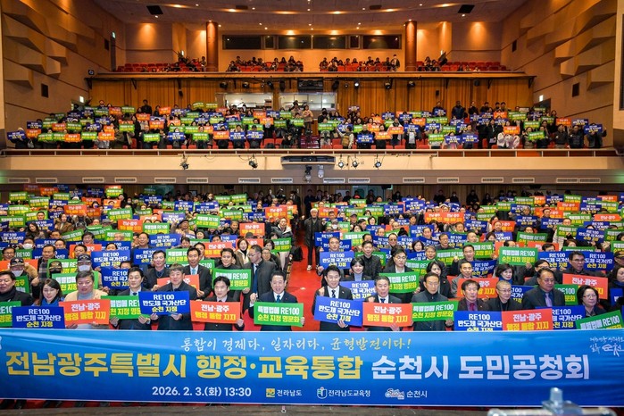 [전남=프레스뉴스] 강래성 기자= 순천시는 전라남도와 함께 3일 순천문화예술회관에서 전남광주특별시 행정·교육 통합 도민 공청회를 개최하고, 통합 추진의 방향과 핵심 과제를 시민과 함께 논의했다.