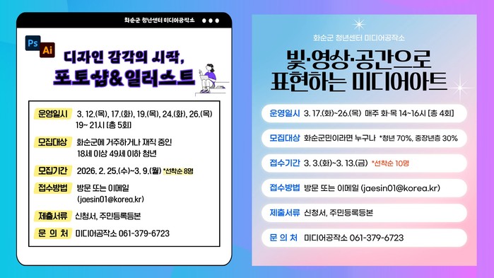 포토샵&일러스트 과정은 화순군에 거주하거나 재직 중인 18세 이상 49세 이하 청년을 대상으로 3월 9일까지 접수한다.