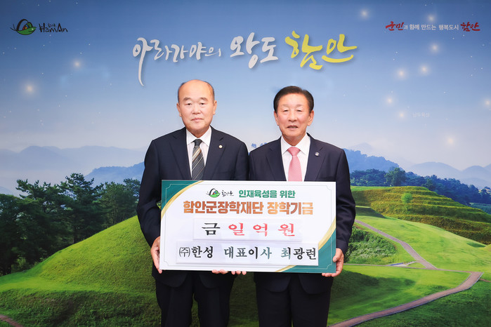 | ▲함안군 대산면에 소재한 방산 협력업체인 (주)한성 최광련 대표는 20일 함안군청을 방문해 지역인재육성을 위한 장학기금 1억 원을 군 장학재단에 기탁했다 (사진=함안군) |