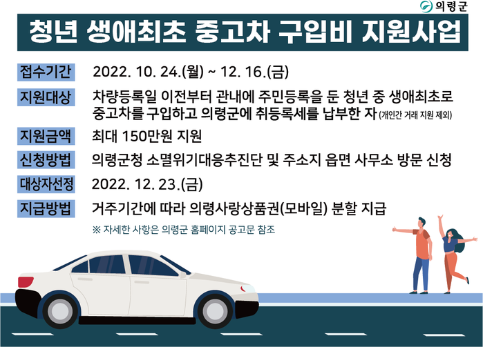 | ▲ 의령군, 청년 생애최초 중고차 구입비 지원사업 추가 접수 시행(의령군 제공) |