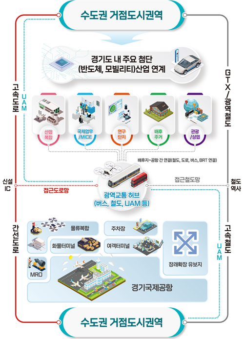아울러 공항을 중심으로 도로, 철도, 도심항공교통(UAM) 등 광역교통 허브를 구축하여 기존 주요 도시, 산업과 연계를 강화하는 한편, 지속가능한 발전을 위해 RE100 기반의 친환경 공항과 배후지를 건설할 예정이다.