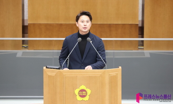 ▲ 경기도의회 더불어민주당 황대호 수석대변인이 7일(화) 열린 제366회 임시회 1차 본회의에서 5분 발언을 하고 있다. (사진=경기도의회 더불어민주당대표의원실) |
