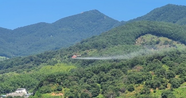 | ▲ 산청군 밤나무 항공방제 모습(사진=산청군) |