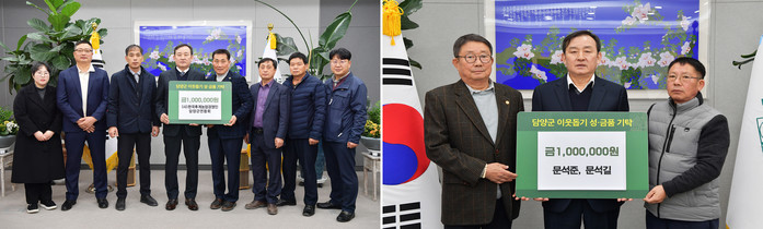 담양군에 따르면, 창평면 주민 문석준, 문석길 형제와 ㈜대유산업, 사단법인 한국후계농업경영인 담양군 연합회에서 각 현금 100만 원을 기탁했다.