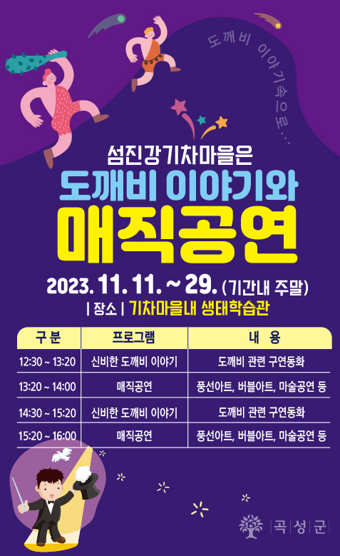 곡성군 관계자는 “곡성 섬진강기차마을을 방문해 도깨비 이야기도 들려주고 마술공연도 보고 체험하며 아이에게 추억도 남기고 늦가을 낭만도 즐길수 있는 소중한 시간이 되시길 바란다”고 말했다.