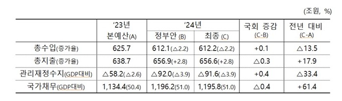 이날 국회를 통과한 내년도 예산안은 지난 9월 국회에 제출된 정부안(656조 9000억 원)보다 약 3000억 원이 감소했다. 국가채무와 정부의 실질적인 재정 상태를 보여주는 관리재정수지는 각각 4000억 원 개선됐다.