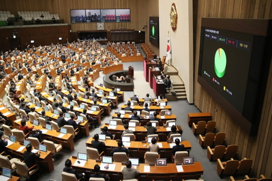 ▲21일 오후 서울 여의도 국회에서 열린 제411회 국회(임시회) 제2차 본회의에서 2024년도 예산안에 대한 수정안이 재적 298인, 재석 259인, 찬성 237인, 반대 9인, 기권 13인으로 가결됐다. (사진= 뉴스1) |