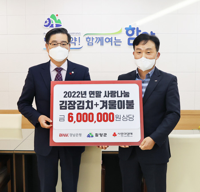 [프레스뉴스] 정재훈 기자= BNK 경남은행 사랑나눔재단은 지난 6일 함양군청을 방문해 연말 사랑나눔사업의 일환으로 600만 원 상당의 김장김치(10kg) 70박스, 이불 50세트를 기탁했다.