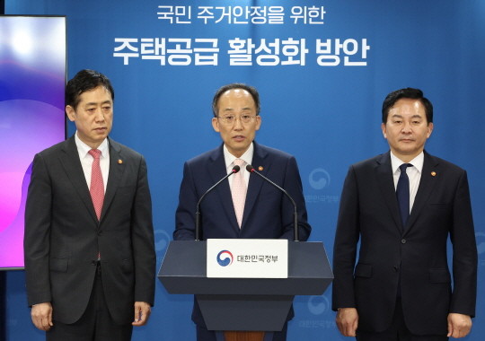 | ▲추경호 경제부총리 겸 기획재정부 장관이 지난 9월26일 정부서울청사에서 주택공급 활성화 방안 발표를 하고 있다. 왼쪽부터 김주현 금융위원장, 추 부총리, 원희룡 국토교통부 장관.(사진= 뉴스1) |