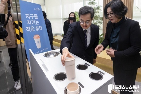 | ▲ 15일 오전 경기도청 1층에서 열린 경기도 1회용 프라스틱 제로 선포식에서 김동연 경기도지사가 사용한 컵을 다회용 컵 수거함에 반납하고 있다.(사진=경기도) |
