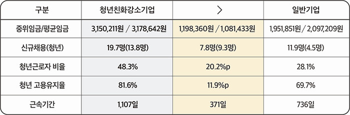 청년근로자 비율 역시 평균 48.3%로 일반기업보다 20.2%p 높았고, 청년고용유지율은 평균 81.6%로 일반기업(69.7%)보다 11.9%p 높고, 근속기간도 일반기업보다 1년 이상(371일) 더 긴 것으로 나타났다.