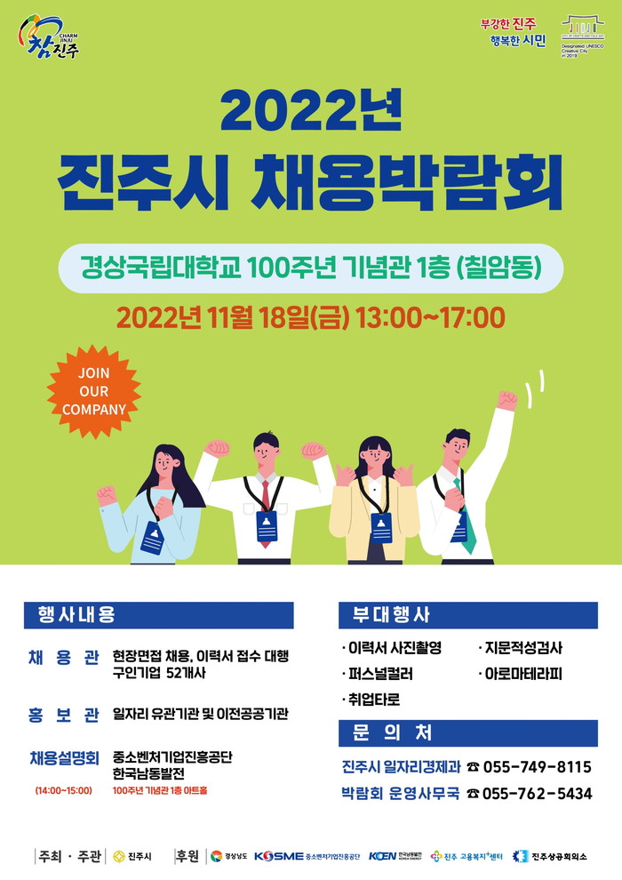[프레스뉴스] 정재훈 기자= 진주시는 침체된 지역 고용시장의 활성화와 구인·구직난 해소를 위하여 11월 18일 경상국립대학교(칠암캠퍼스) 100주년 기념관에서 ‘2022년 진주시 채용박람회’를 개최한다.