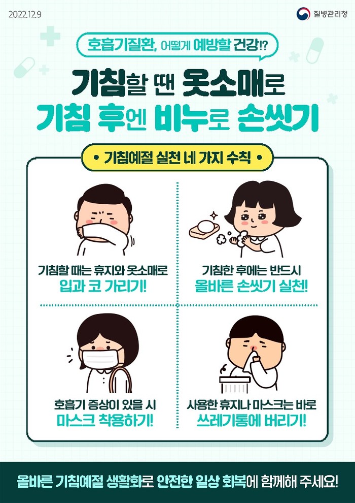 호흡기감염병을 예방하기 위해서는 올바른 손씻기와 기침예절 지키기, 실내환기를 생활화하고, 감염병 의심증상이 발생한 경우에는 곧바로 가까운 의료기관을 방문하여 진료를 받아야 한다.