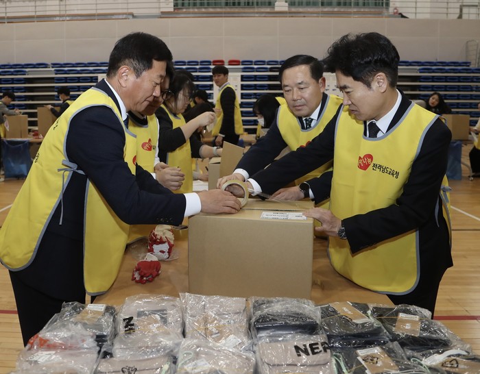 도교육청은 수혜 학생들이 선호하는 플리스 재킷과 실생활에 도움이 되는 크로스백 등의 생활용품을 선물로 준비해 이날 김대중 교육감을 비롯한 간부들이 참석한 가운데 정성들여 포장했다.
