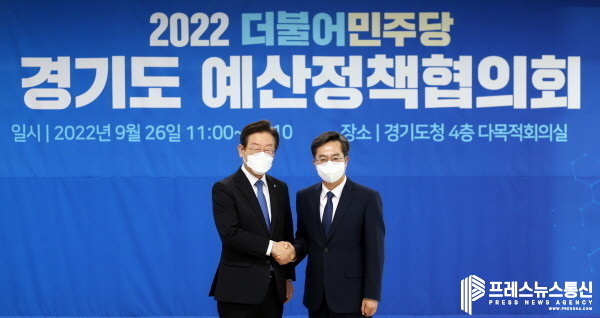 | ▲ 26일 오전 경기도청 4층 다목적회의실에서 열린 경기도-더불어민주당 예산정책협의회에서 김동연 경기도지사와 이재명 더불어민주당 대표가 기념촬영을 하고 있다.(사진=경기도) |
