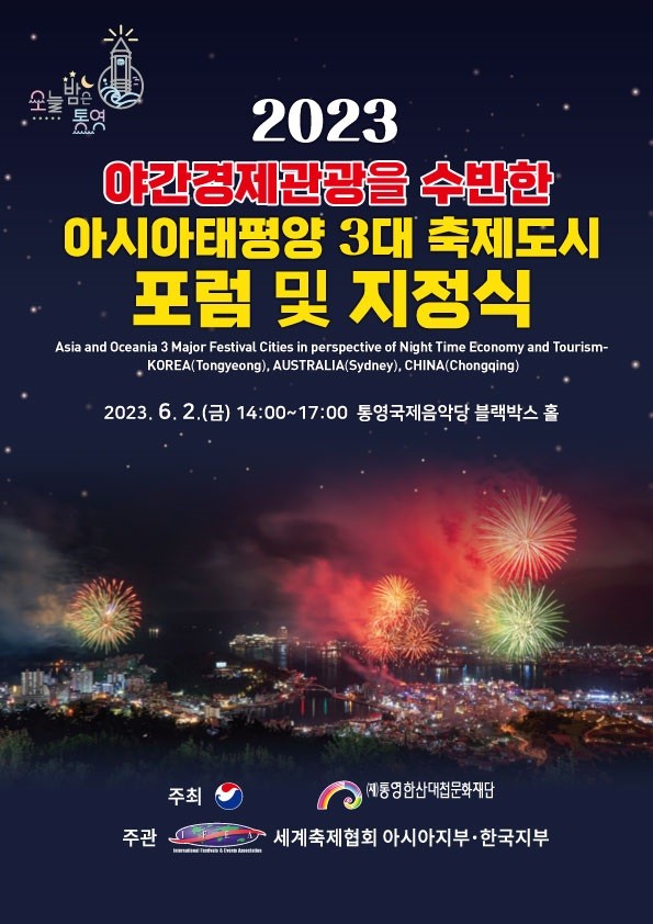 [프레스뉴스] 정재훈 기자= 통영시에서는 오는 6월 2일(금) 오후 2시부터 ‘2023 야간경제관광을 수반한 아시아.태평양 3대 축제도시 포럼 및 지정식’을 3개국 200여명의 축제 전문가 등이 참여한 가운데 통영국제음악당 블랙박스에서 개최할 예정이다.