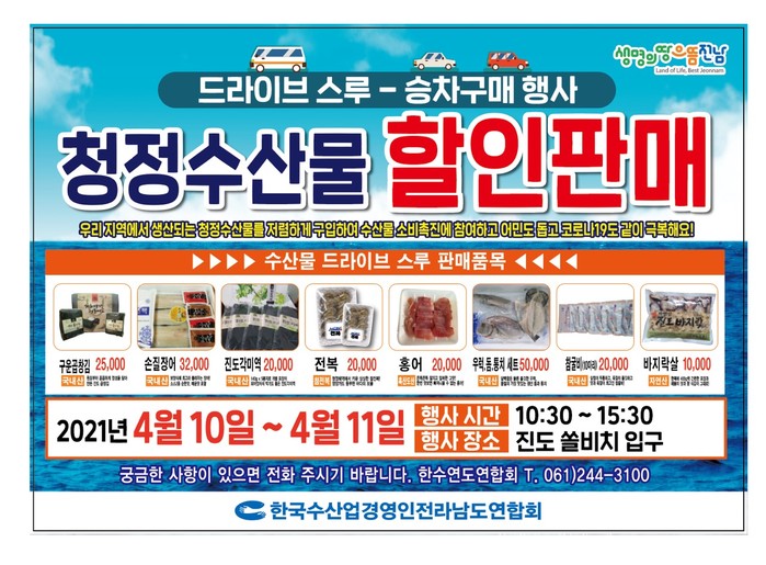 [전남=프레스뉴스] 강래성 기자=전라남도는 생명이 움트는 봄을 맞아 진도 쏠비치 인근에서 10일부터 이틀간 수산물 승차구매(드라이브스루) 행사를 펼친다고 밝혔다.