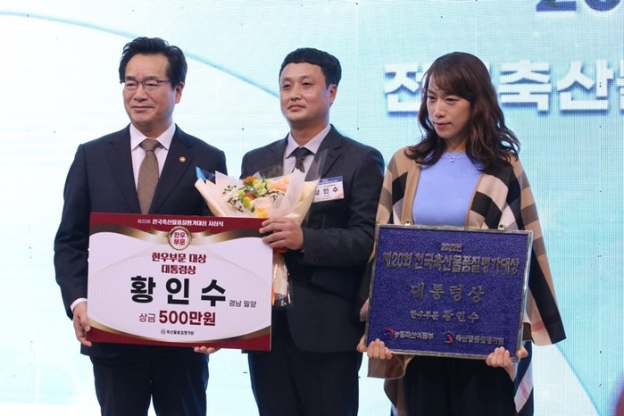 ▲ 제20회 전국축산물품질평가대상’ 시상식에서 밀양시 무안면의 황인수(42) 한우농가가 대통령상을 수상했다. (사진=밀양시) |