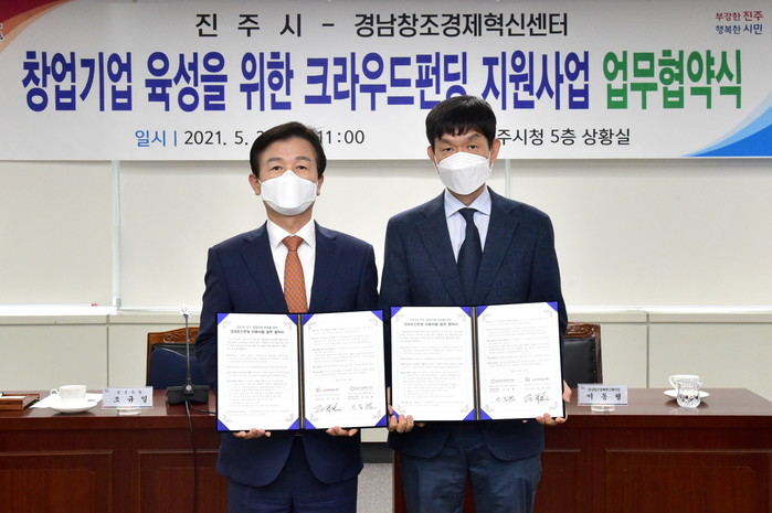 | ▲ 2021년 5월 31일, 창업기업 육성을 위한 크라우드펀딩 지원사업 업무협약 체결(진주시-경남창조경제혁신센터) |
