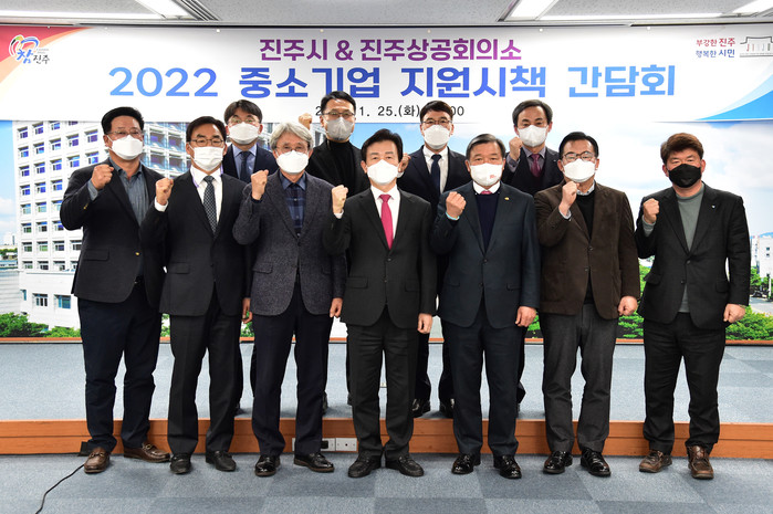 | ▲ 진주시-진주상공회의소, 2022년 중소기업 지원시책 신년 간담회 개최 후 기념촬영(사진=진주시) |
