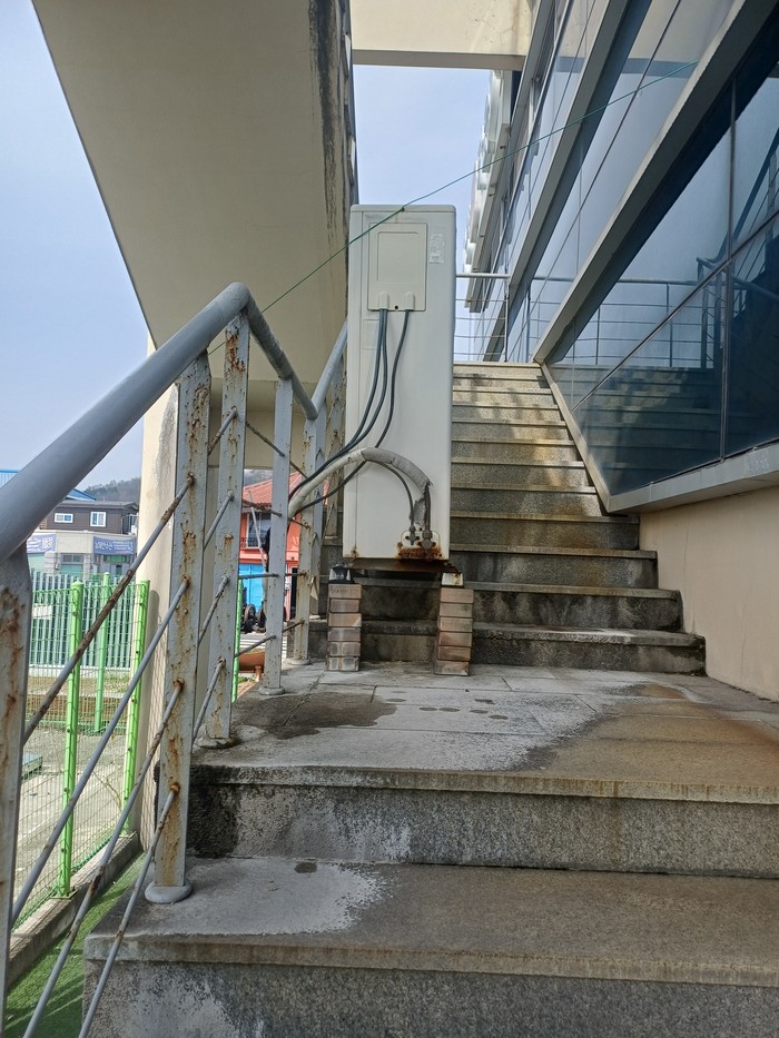 | ▲계단 입구를 맞고 있는 장애물 에어컨 실외기(냉각기)/강래성 기자 |