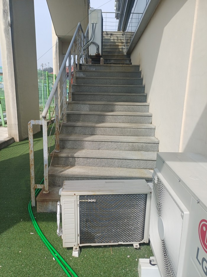 | ▲계단위에 설치된 에어컨 실외기/강래성 기자 |