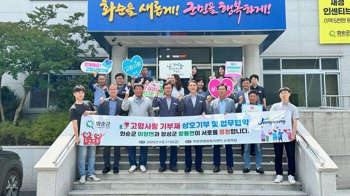 [전남=프레스뉴스] 박정철 기자=화순군(군수 구복규)은 지난 21일 이양면과 장성군 황룡면이 이양면행정복지센터에서 건전한 기부문화 확산 및 두 지역의 상생발전을 위한 고향사랑 기부금 상호기부 및 업무협약을 체결하였다고 밝혔다.