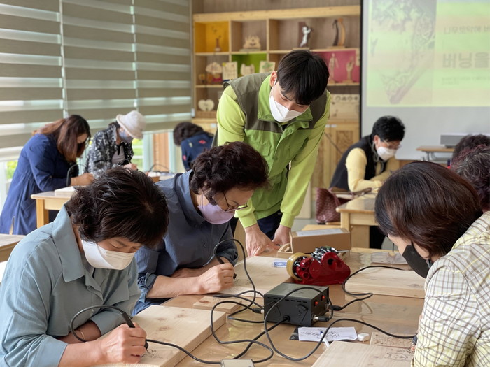 ▲ 생활목공체험-우드버닝(wood burning)은 목재에 버닝기를 활용해 나무를 태워 그림을 그리는 창작활동으로, 생활용품을 만드는 생활목공 체험 품목에 도입하여 하나뿐인 독특한 생활 목공예품을 만들 수 있다.(사진=진주시) |