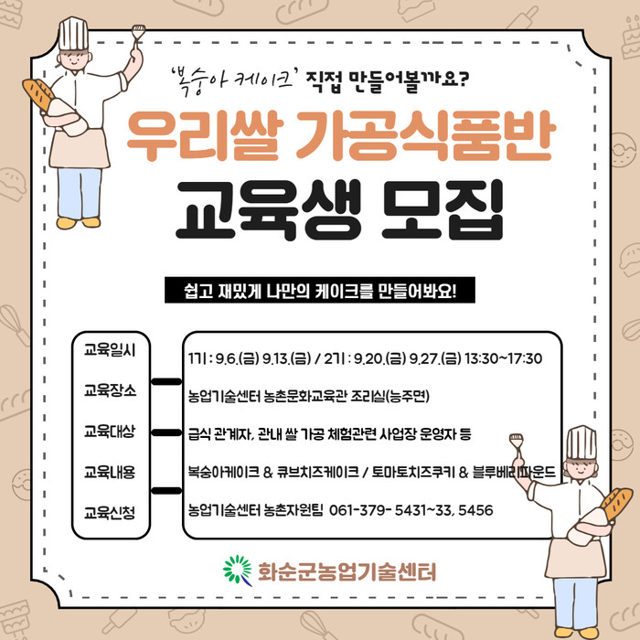| ▲화순군, 우리쌀 가공식품반 교육생 모집 홍보 포스터(사진제공=화순군) |