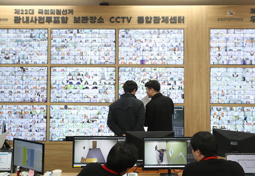 | ▲과천시 중앙선거관리위원회 선거종합상황실에서 관계자들이 시범 운영 중인 관내사전투표함 및 우편투표함 보관장소 CCTV를 살펴보고 있다. (사진= 뉴스1) |