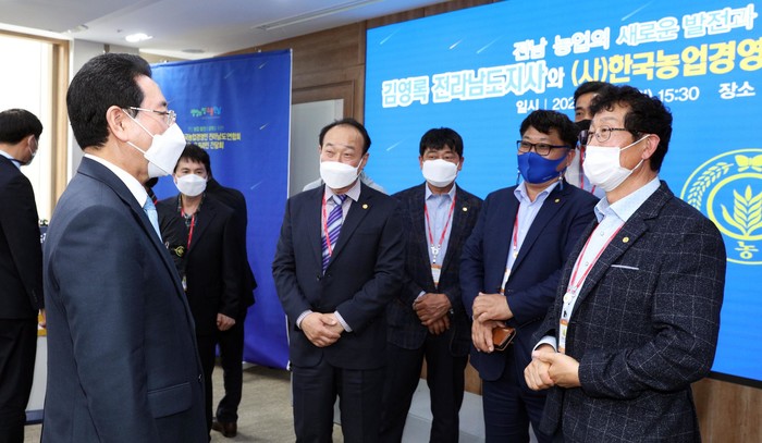 [전남=프레스뉴스] 강래성 기자=김영록 전라남도지사는 29일 도내 농업인단체인 한국농업경영인 전라남도연합회 임원진과 소통간담회를 갖고 첨단 ICT기술을 농업에 접목한 스마트 농업 육성, 기후변화에 대응한 아열대농업 구축, 수축농업확대 등 폭넓은 대화를 나눴다.