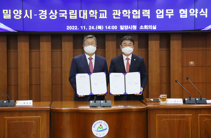 [프레스뉴스] 정재훈 기자= 밀양시와 경상국립대학교는 24일 시청 소회의실에서 신사업 개발 및 산학 과제 공동 협력을 위한 업무협약을 체결했다.