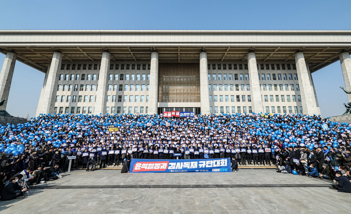 [프레스뉴스] 강보선 기자= 더불어민주당이 17일 국회 본청 앞 계단에서 '윤석열 정권 검사독재 규탄대회'를 열었다.
