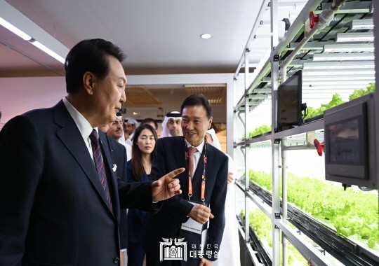 | ▲카타르를 국빈 방문하는 윤 대통령이 24일(현지시각) 도하 알 비다 공원 엑스포하우스에서 열린 도하 국제원예박람회 한국관 개관식에 참석한 뒤 한국형 스마트농업 전시관에 설치된 농심 수직농장에서 이병학 농심 대표로부터 설명을 듣고 있다. (사진= 대통령실) |