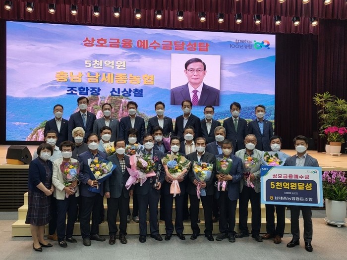 ▲ 세종시 남세종농협이 상호금융 여·수신 1조원을 달성, 지난 2일 농협 중앙회 정례조회에서 상호금융예수금 5000억 달성탑을 수상했다. (사진=남세종농협 제공) |