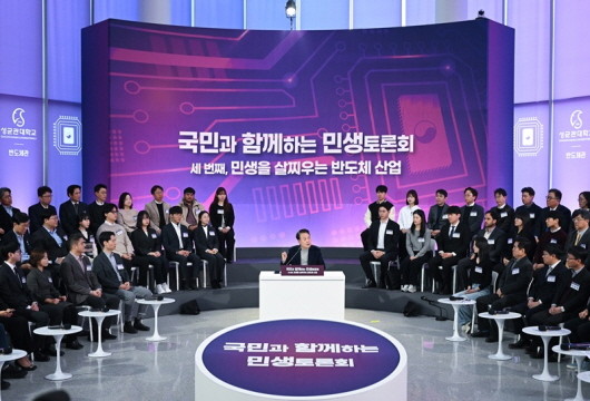 | ▲윤 대통령이 15일 경기도 수원 성균관대 자연과학캠퍼스 반도체관에서 ‘민생을 살찌우는 반도체 산업’을 주제로 열린 세 번째 국민과 함께하는 민생토론회에서 발언하고 있다.(사진= 뉴스1) |