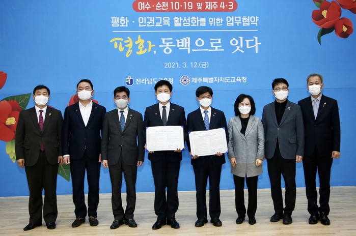 전남교육청과 제주교육청은 지난 12일(금) 오후 여수교육지원청 대회의실에서 업무협약을 맺고 평화·인권교육 활성화를 위해 상호협력하기로 합의한 데 이어 유성수 교육위원장 등 전남도의원들이 지원과 협력을 약속하고 나섰다.