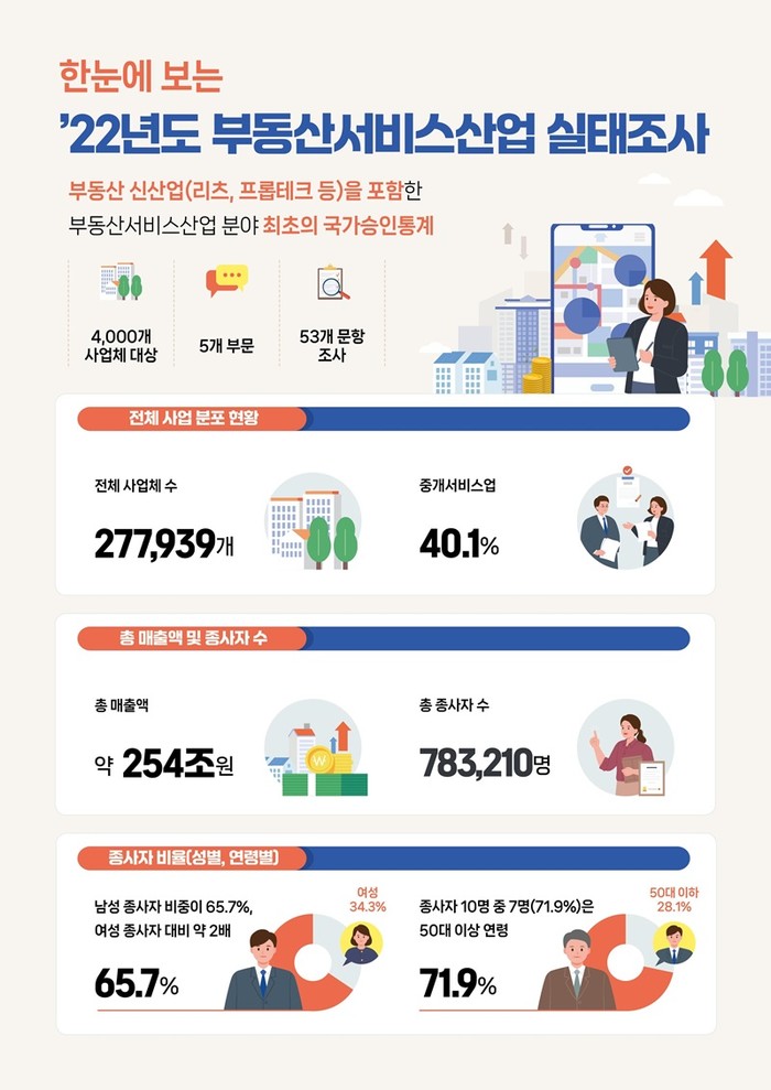 국토교통부는 8일 전국에서 부동산서비스산업을 운영하고 있는 4000개의 표본 사업체를 대상으로 조사한 ‘2022년도 부동산서비스산업 실태조사 결과’를 공표했다.