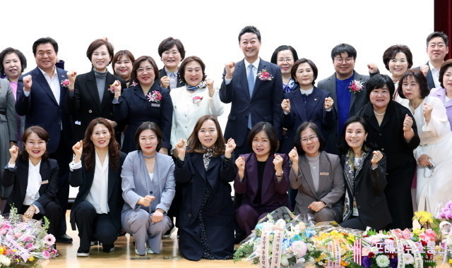 | ▲김진경 경기도의회 의장이 20일 오후 수원 경기종합노동복지회관에서 열린 사단법인 경기도어린이집연합회 제2·3대 회장 이·취임식에서 참석자들과 기념촬영을 하고 있다.(사진=경기도의회) |