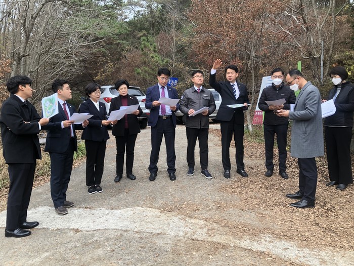 ▲ 진주시의회 경제복지위원회가 반려동물종합지원센터 건립부지 후보지를 찾아 현지 확인하고 있다. (사진=진주시의회) |
