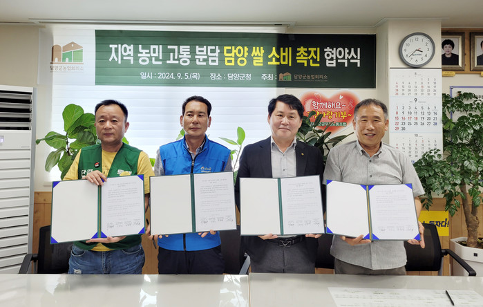 담양군에 따르면, 공무원노동조합총연맹 담양군조합(위원장 김길엽), 전국민주연합노조 담양군지부(지부장 윤연호)는 지난 5일 담양군 공노총 조합사무실에서 담양군 농업회의소(대표 이문태) 및 담양군농협쌀조합공동사업법인(대표 이종혁)과 4자 업무 협약(MOU)을 체결하고 담양쌀 소비 촉진을 위한 협력과 지원을 다짐했다.