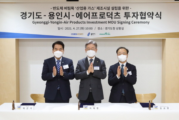 이재명 경기도지사와 백군기 용인시장, 김교영 에어프로덕츠코리아 사장은 27일 경기도청에서 산업용 가스시설 설립을 위해 상호협력하는 내용의 투자협약서에 공동으로 서명했다.