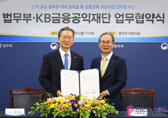 [프레스뉴스] 류현주 기자= KB금융공익재단(이사장 양종희)은 23일, 정부과천종합청사에서 국가 법질서와 사회 안전을 위해 헌신한 공무원과 가족을 지원하기 위해 법무부(장관 정성호)와 '순직·공상 공무원 자녀의 장학금 및 맞춤형 금융교육 지원을 위한 업무협약(MOU)'을 체결했다.