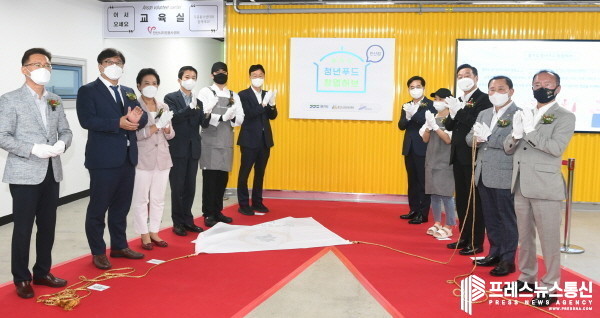 | ▲ 22일 오후 경기도 안산시 단원구 초지동에 위치한 청년푸드창업허브에서 이민근 안산시장과 김동연 경기도지사 등 관계자들이 경기도 청년푸드창업허브 1호점 간판 제막을 하며 기념촬영을 하고 있다.(사진=안산시) |