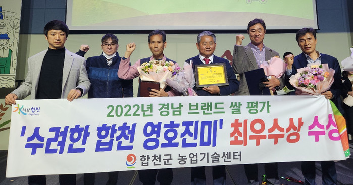 창원컨벤션센터(CECO)에서 진행된 ‘2022년 경남 브랜드 쌀 시상식’은 지난 9월 선정된 경남 브랜드 쌀 평가 순위에 따라 도내 5가지 브랜드 쌀에 대해 시상했으며, ‘수[水]려한 합천 영호진미’는 2020년 ‘우수’, 2021년 ‘우수’에 이어 올해는 ‘최우수상’을 차지하는 쾌거를 거두었다.