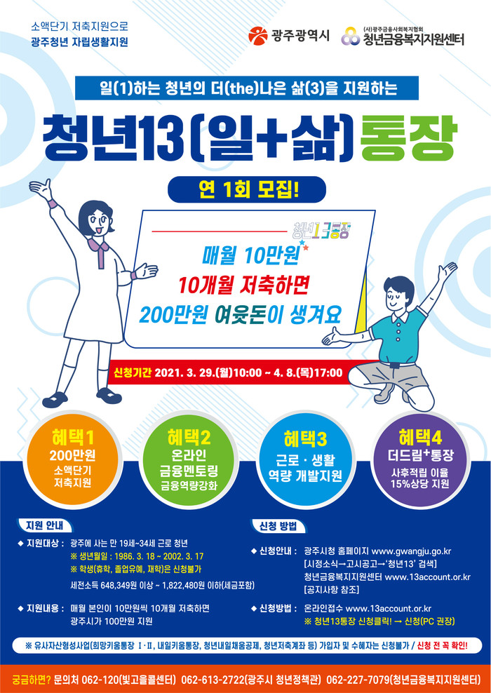 [광주=프레스뉴스] 강래성 기자=광주광역시는 일하는 청년의 경제적 자립과 생활안정을 지원하는 ‘청년13(일+삶)통장’ 6기 참여자를 29일부터 다음달 8일까지 모집한다.