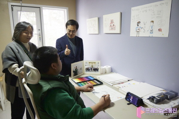 김 지사의 방문에 작가들도 환영의 뜻을 표하며 ‘니얼굴’ 정은혜 작가가 깜짝 선물로 경기도지사의 얼굴을 그린 그림을 직접 전달하기도 했다. 김 지사는 “제가 받았던 선물 중 최고”라며 감사를 표했다.